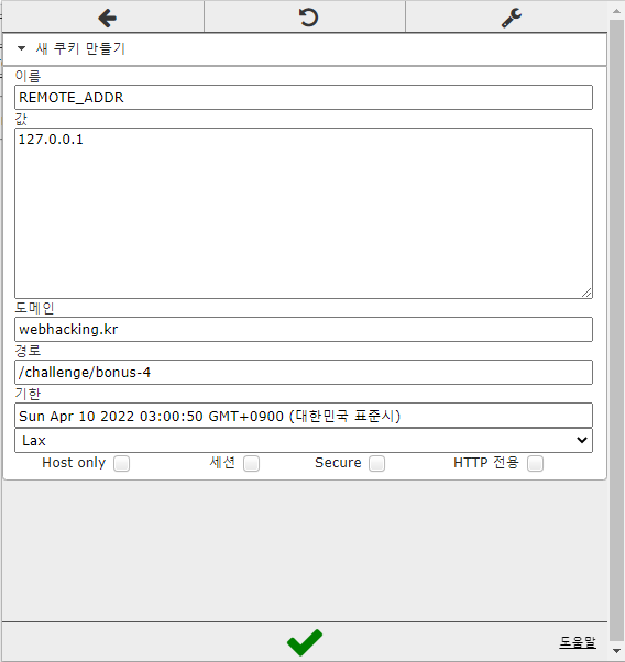 이를 정확히 확인하기 위해 EditThisCookie를 사용하여 REMOTE_ADDR을 생성하고 127.0.0.1을 입력해보았다.