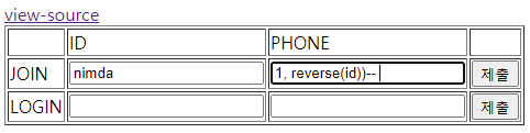 즉, id = nimda, phone에 1, reverse(id))--를 넣으면