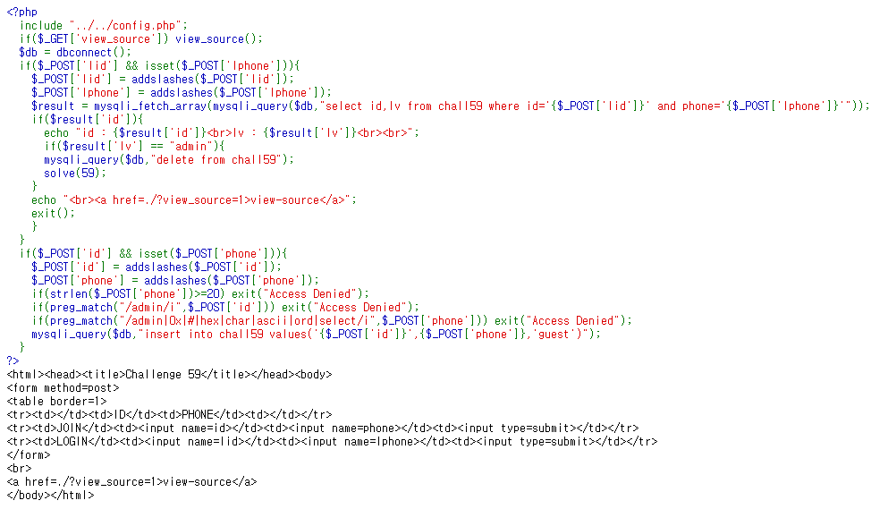 select id,lv from chall59 where id='{$_POST['lid']}' and phone='{$_POST['lphone']}'