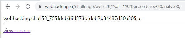 ?val=1 procedure analyse();를 입력하였더니 위와 같은 화면이 나왔다.